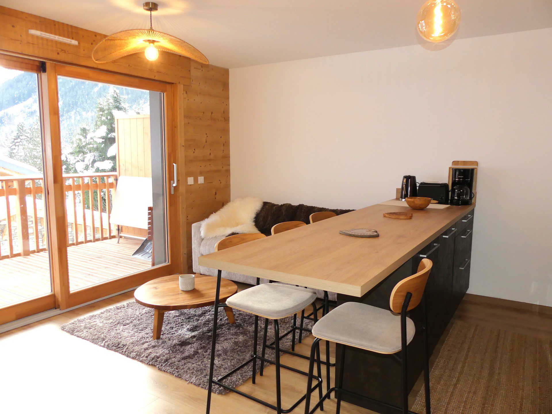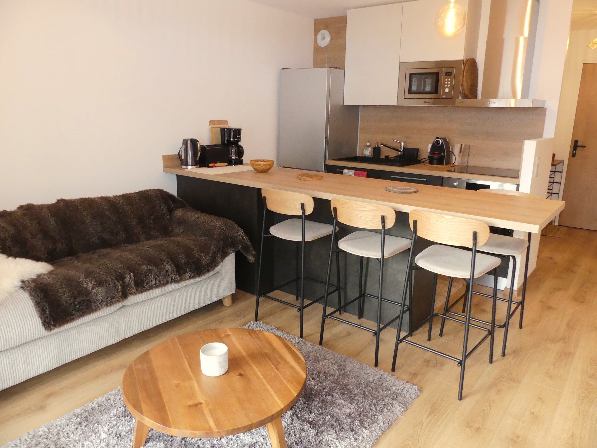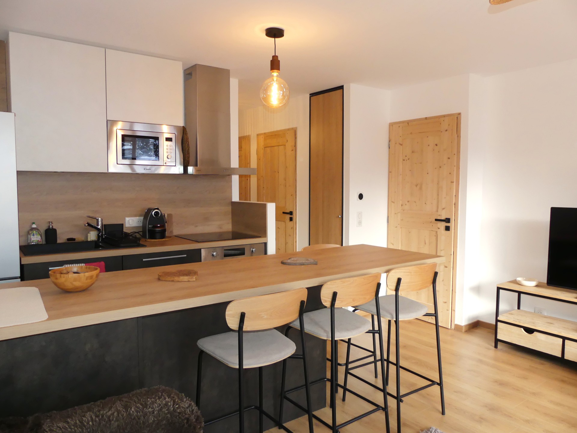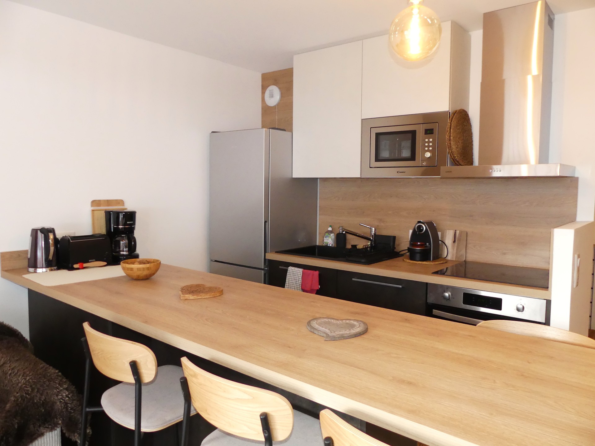 COIN CUISINE avec lave-vaisselle, four traditionnel, micro-ondes, plaque induction 3 feux, hotte, réfrigérateur, congélateur, cafetière flitre et Nespresso, bouilloire, grille-pain, service à raclette, service à fondue, barbecue électrique.